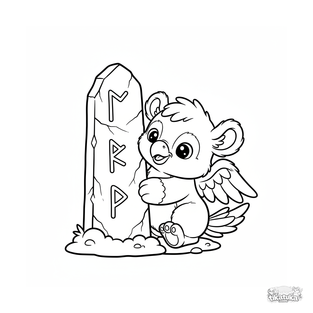 Página para colorear para niños pequeños: un bebé grifo espiando detrás de un monolito rúnico. Formas simples, amplios márgenes.