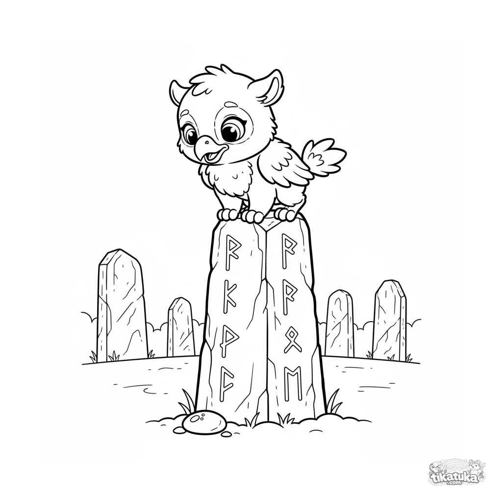 Página para colorear para niños 4-6: un curioso bebé grifo se posa en un antiguo monolito con runas. Formas simples, personaje amigable.