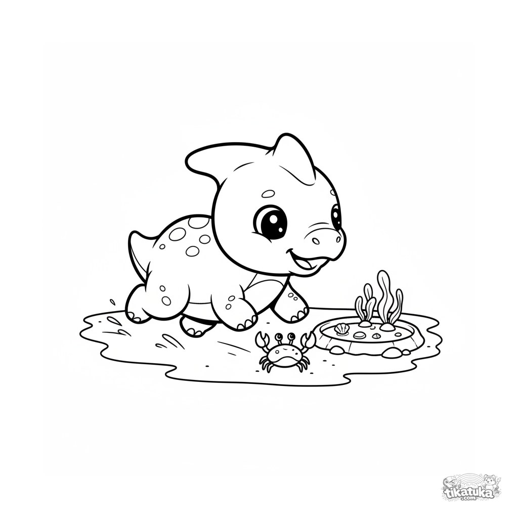 Página simple para colorear para niños pequeños de 2-3 años: un bebé parasaurolophus persigue un cangrejito en una playa antigua. Formas grandes, pocos detalles.