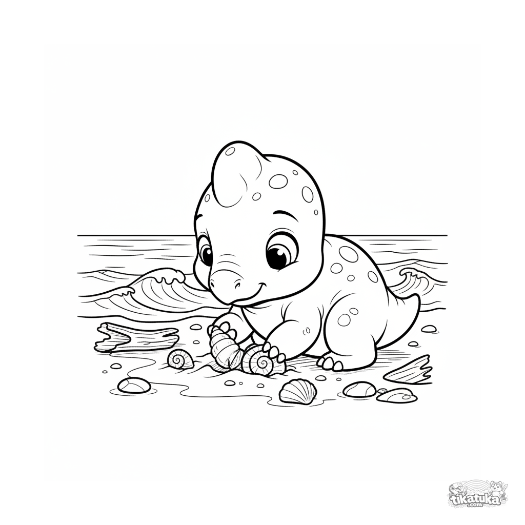 Página para colorear para niños 4-6: un bebé parasaurolophus explora la playa de arena de un océano antiguo, buscando conchas. Escena linda para desarrollar la motricidad fina.