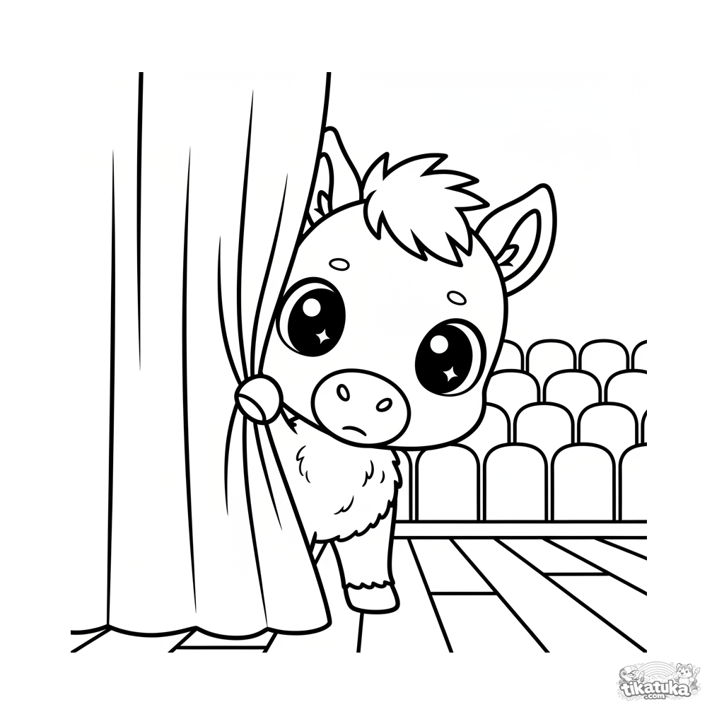 Página para colorear simple para niños de 2-3 años: un pequeño poni bebé se asoma con curiosidad desde detrás de una cortina de teatro.