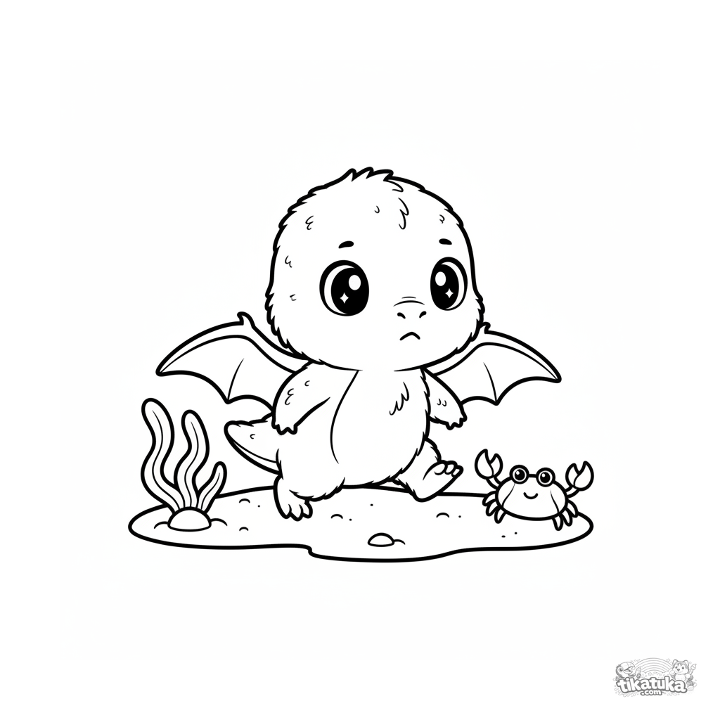 Página para colorear simple para niños pequeños 2-3: un bebé pterosaurio esponjoso dando sus primeros pasos en la arena de una playa antigua. Formas grandes y simples.