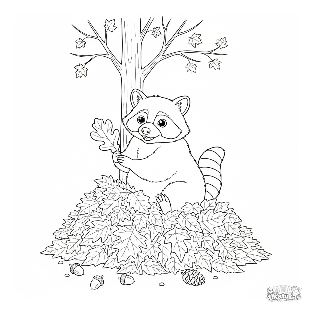 Página para colorear de un mapache bebé en otoño. Para niños de 4 a 6 años. Un mapachito curioso asomándose de un montón de hojas coloridas.