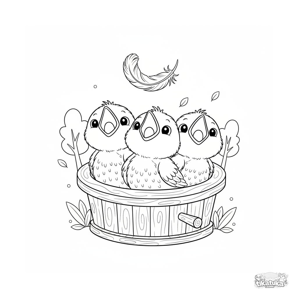 Página para colorear para niños 4-6: tres polluelos esponjosos de petirrojo esperan a los padres en una casa de pájaros de madera. Escena dulce en estilo acuarela.