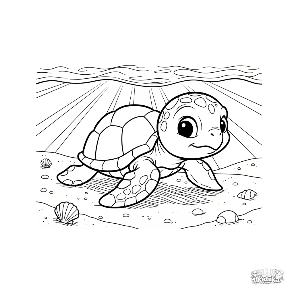 Página para colorear para niños de 7 a 9 años: una tortuguita marina se arrastra por la arena hacia la superficie soleada en aguas poco profundas.