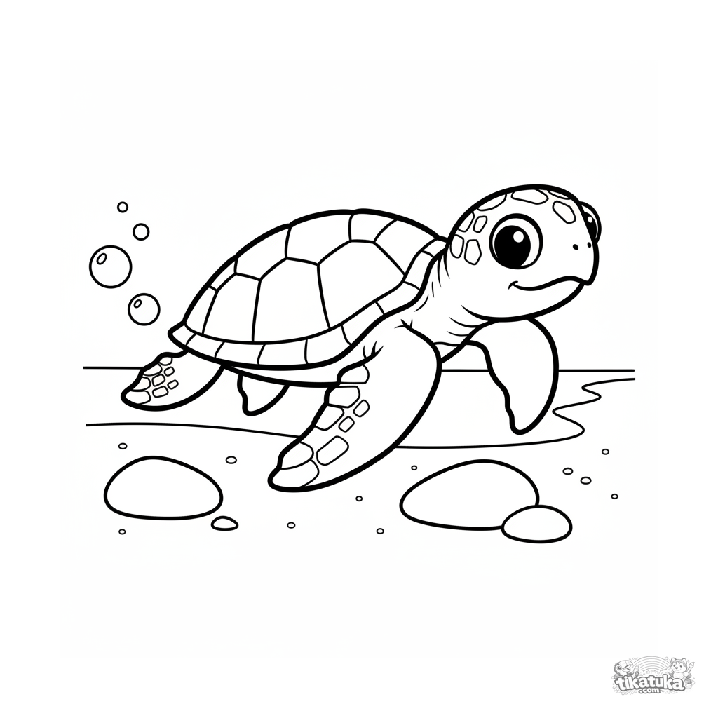 Página para colorear simple para niños pequeños de 2-3 años: Una tortuga marina bebé nada en aguas poco profundas soleadas cerca de una playa de arena.
