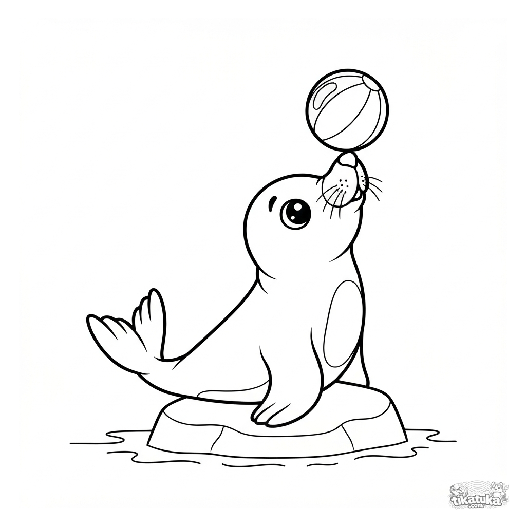 Página para colorear para niños 3-5: una foca bebé equilibra una pelota en su nariz. Tema divertido con fondo mínimo para colorear fácil.