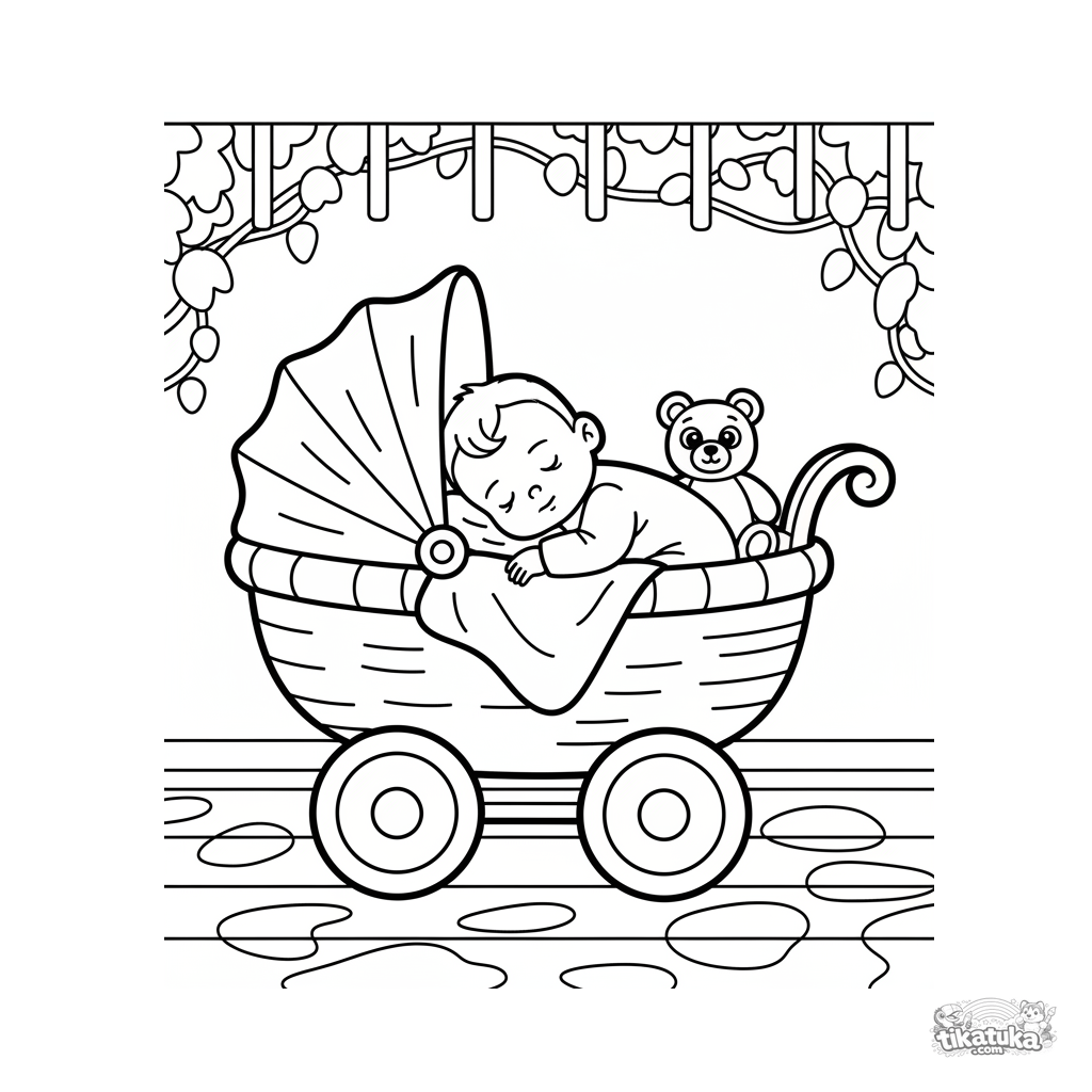 Página para colorear muy simple para niños pequeños: un bebé durmiendo en un cochecito a la sombra. Formas grandes cerradas, casi sin fondo, márgenes amplios.