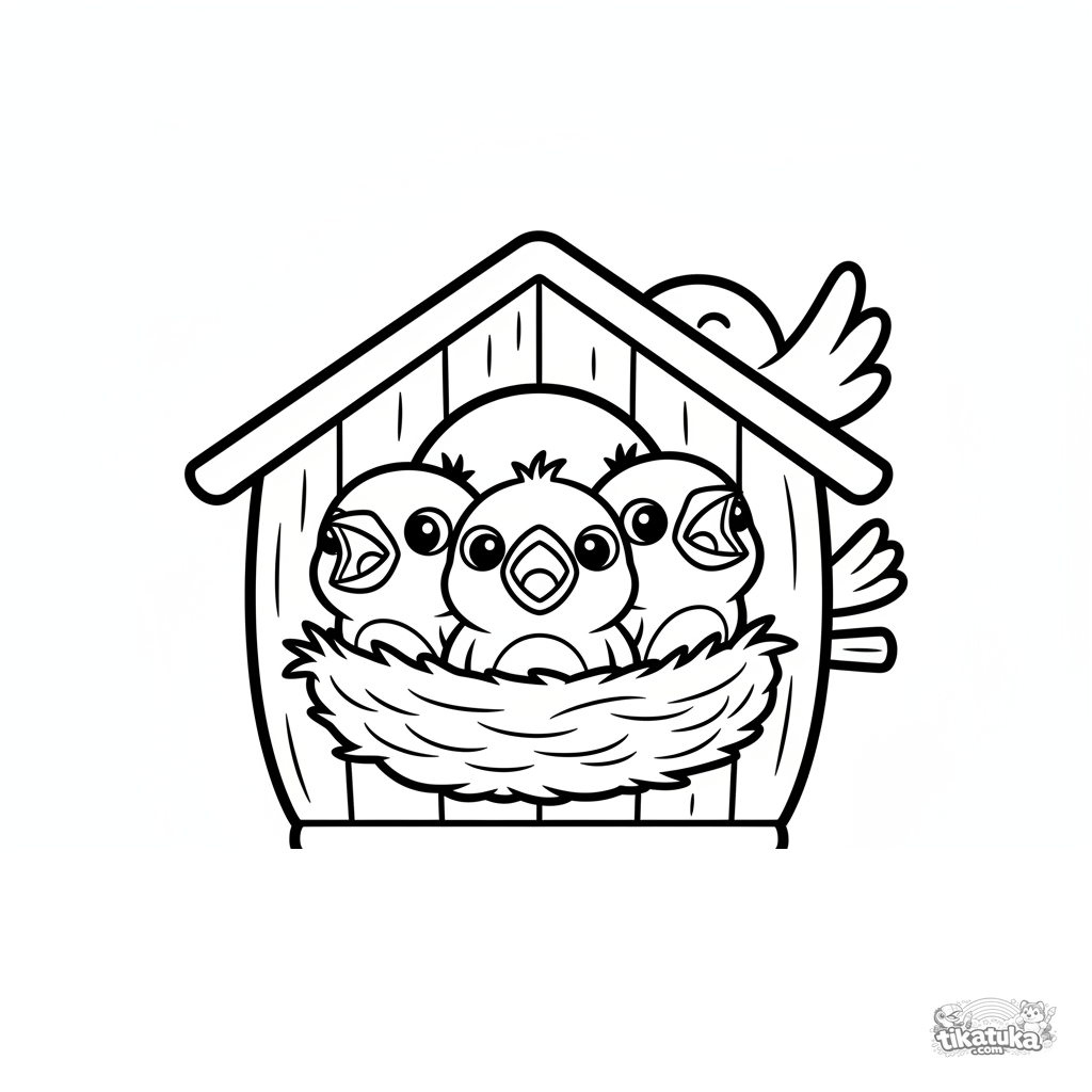 Página para colorear para niños pequeños 2-3: tres pajaritos esponjosos de gorrión en un nido acogedor dentro de una pajarera de madera. Formas grandes y simples, pocos detalles.