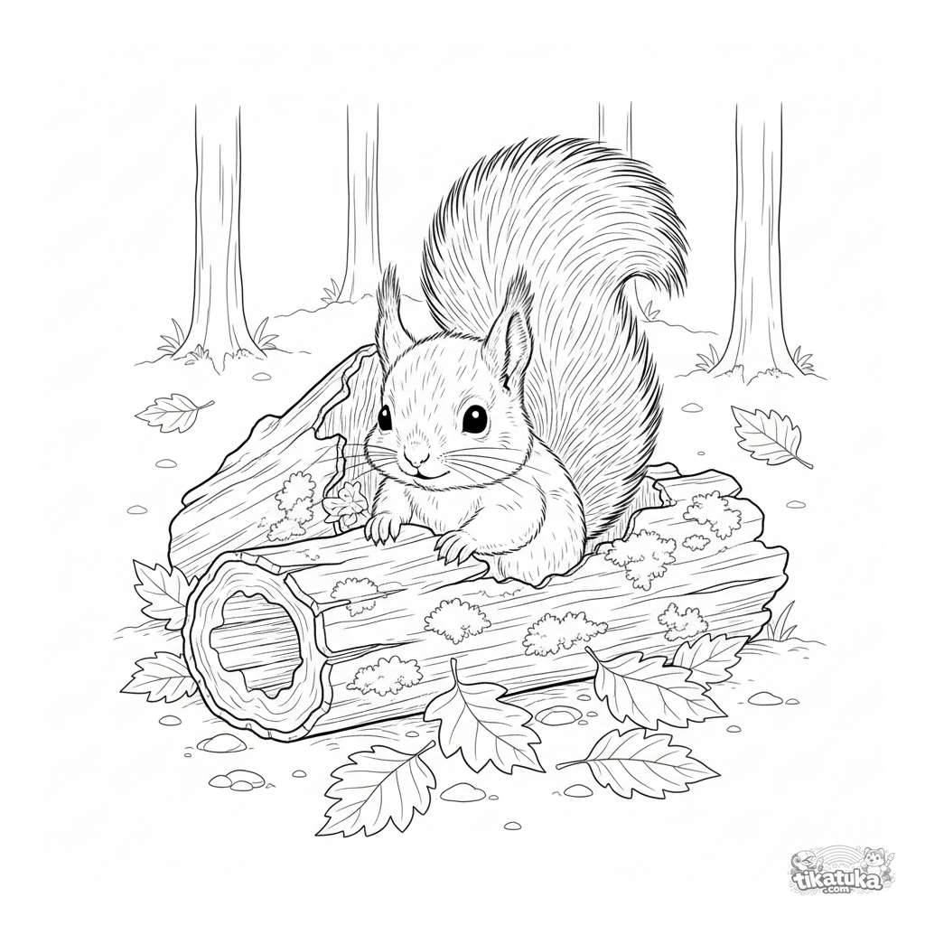 Página para colorear para niños: una linda ardilla bebé asoma desde un tronco hueco en un bosque otoñal. Detalle medio para desarrollar habilidades.