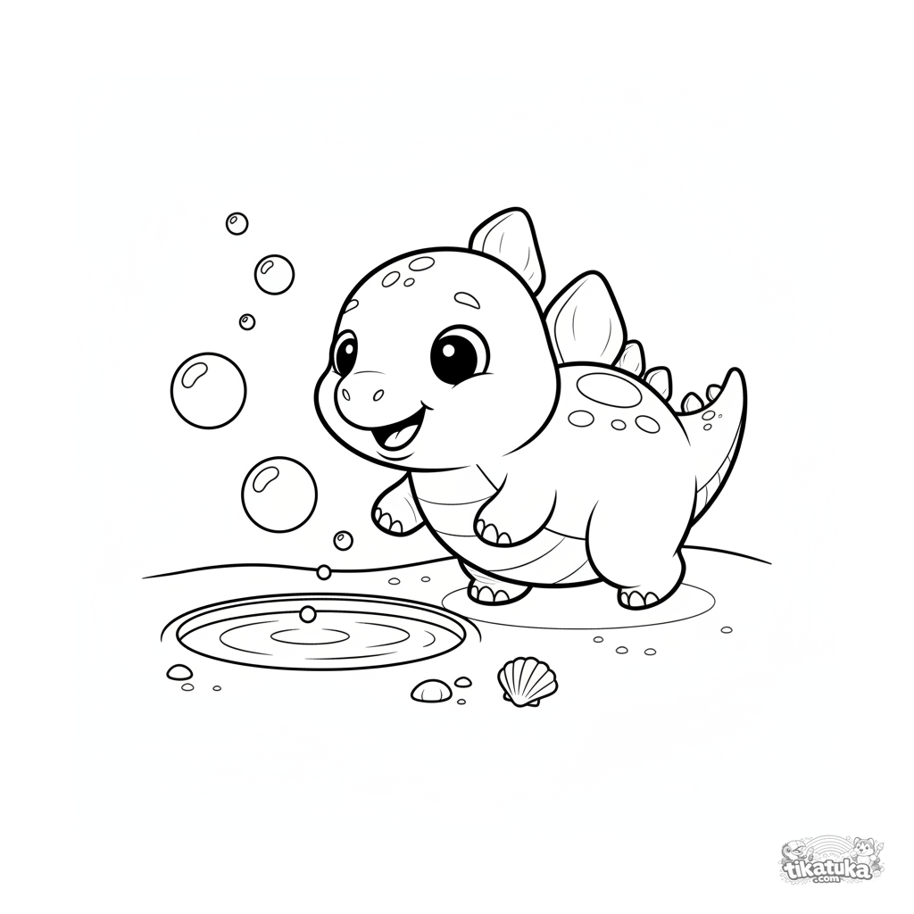 Página para colorear simple para niños pequeños 2-3: un bebé estegosaurio persigue burbujas de un charco de marea en una playa antigua. Formas grandes y claras, detalles mínimos.