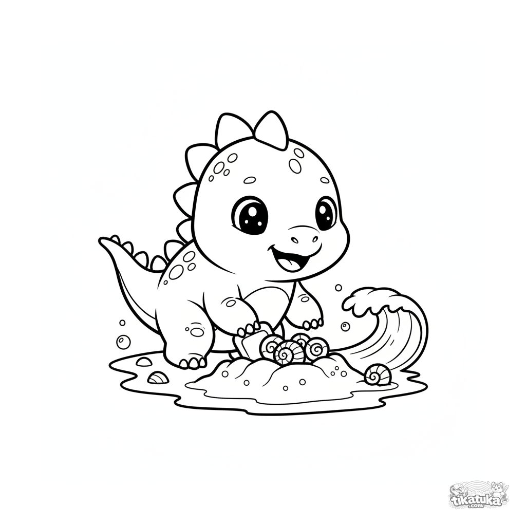 Página para colorear simple para niños pequeños 2-3: un lindo bebé estegosaurio excava un hoyo en la arena de una playa antigua, encontrando conchas. Formas grandes, contornos gruesos.