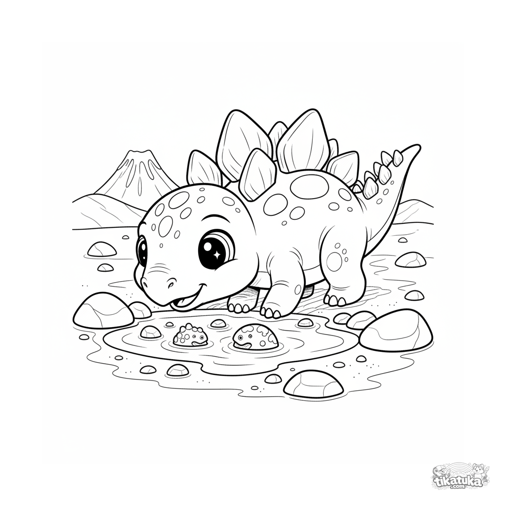 Página para colorear para niños 4-6: un lindo bebé estegosaurio con grandes placas explora una poza rocosa en una playa antigua. Fondo minimalista.