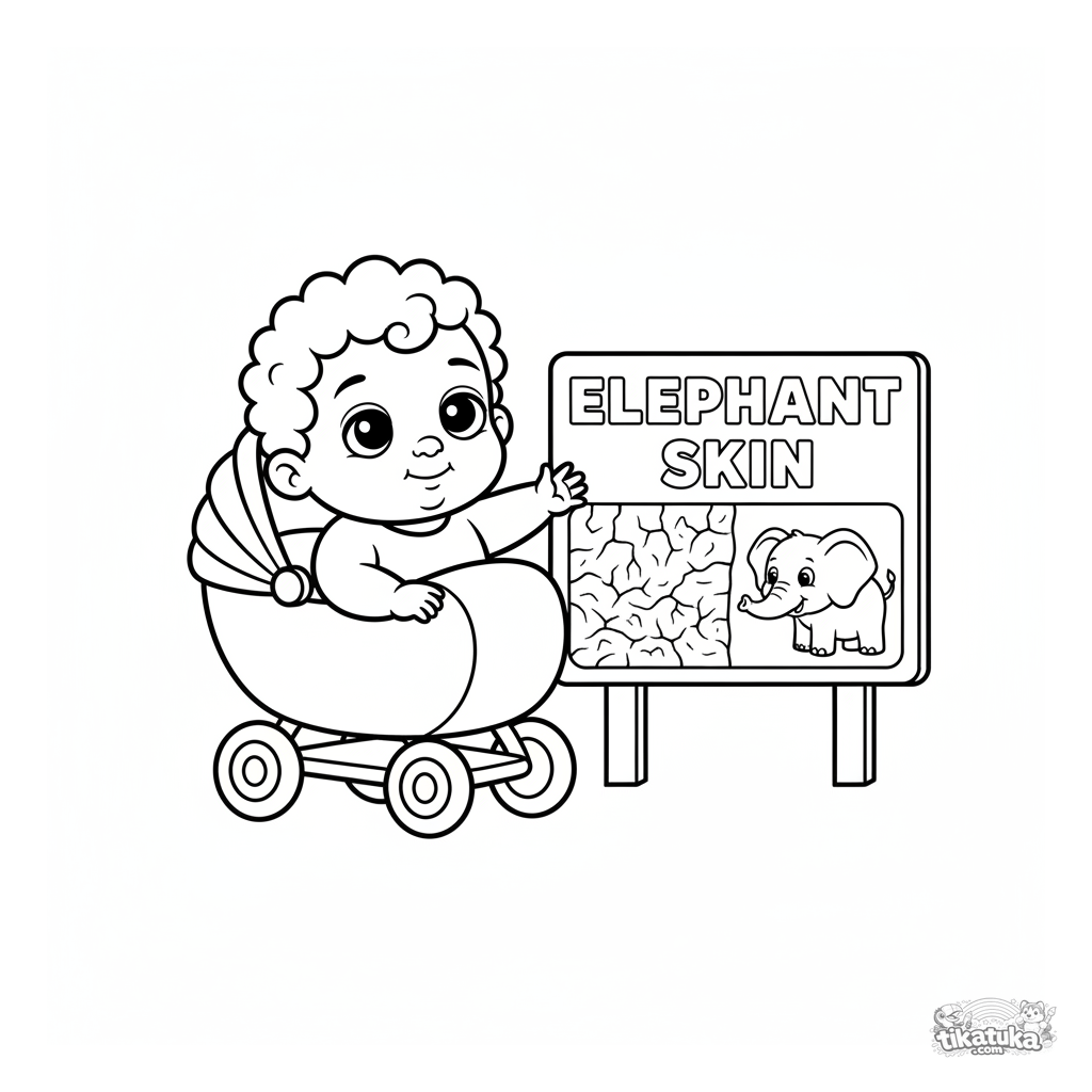 Página para colorear muy simple para niños pequeños de 2-3 años: un bebé toca un panel táctil que representa la piel de elefante en un cartel del zoológico. Formas grandes y claras.