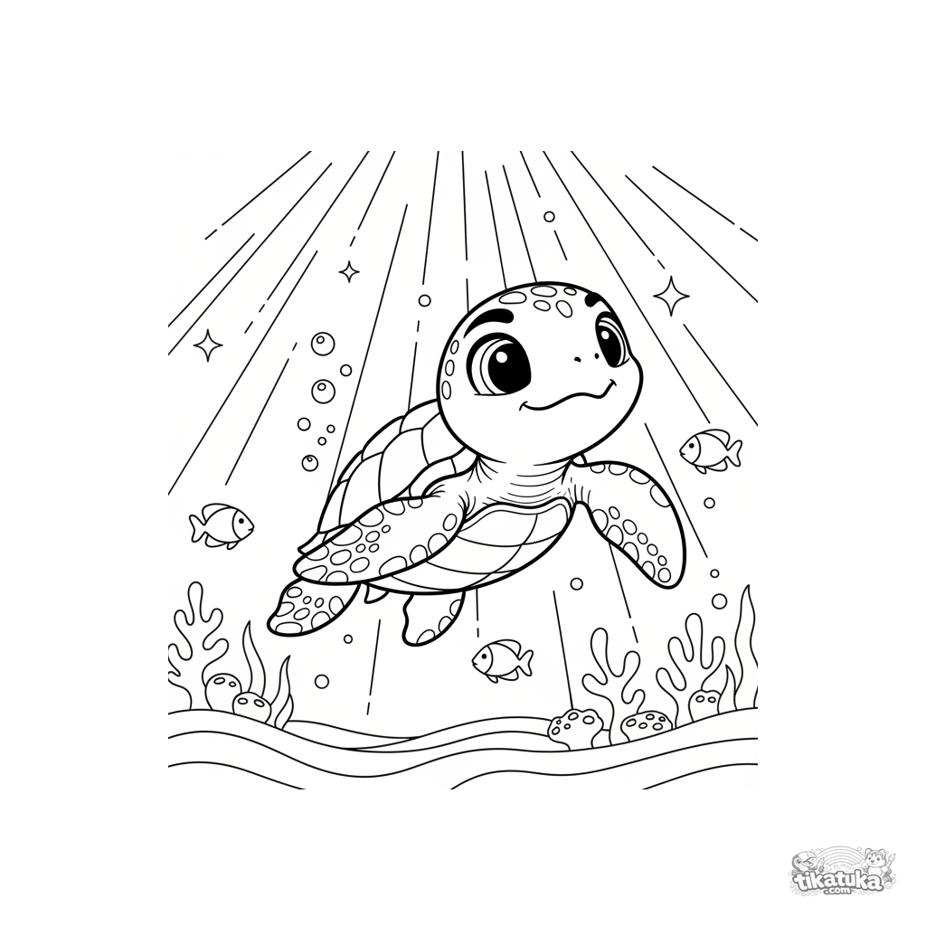 Página para colorear para 7-9 años: una tortuguita marina recién nacida nadando hacia la superficie en un rayo de sol en aguas poco profundas.