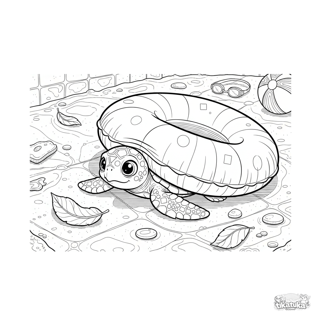 Página para colorear detallada para niños mayores de 10-12 años: una pequeña tortuguita con rasgos naturalistas asoma desde debajo de un flotador en el fondo de la piscina. Patrón del caparazón y texturas.