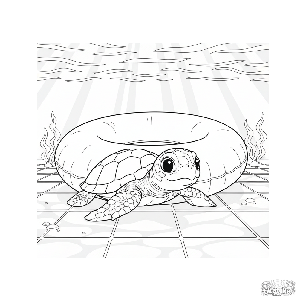 Página para colorear para niños de 7-9 años: una pequeña tortuguita asoma curiosa desde debajo de un aro inflable en el fondo de la piscina.