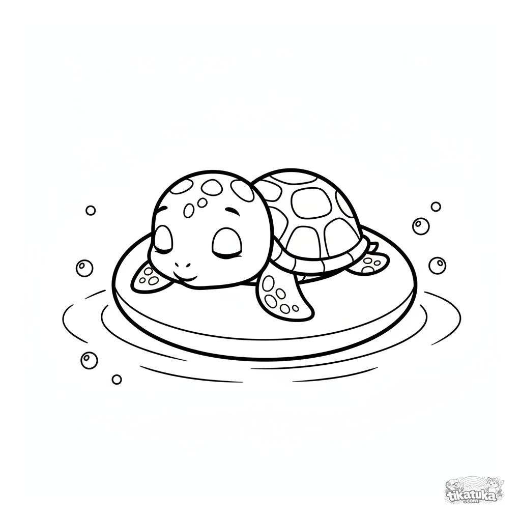 Página simple para colorear para niños pequeños: tortugita durmiendo en un anillo inflable en una piscina. Formas grandes, pocos detalles. Para niños de 2 a 3 años.