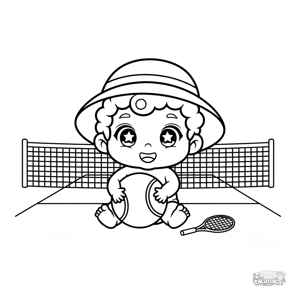 Página para colorear para niños pequeños 2-3 años: bebé feliz abrazando pelota de tenis gigante. Formas simples grandes, mínimo detalle, márgenes amplios.