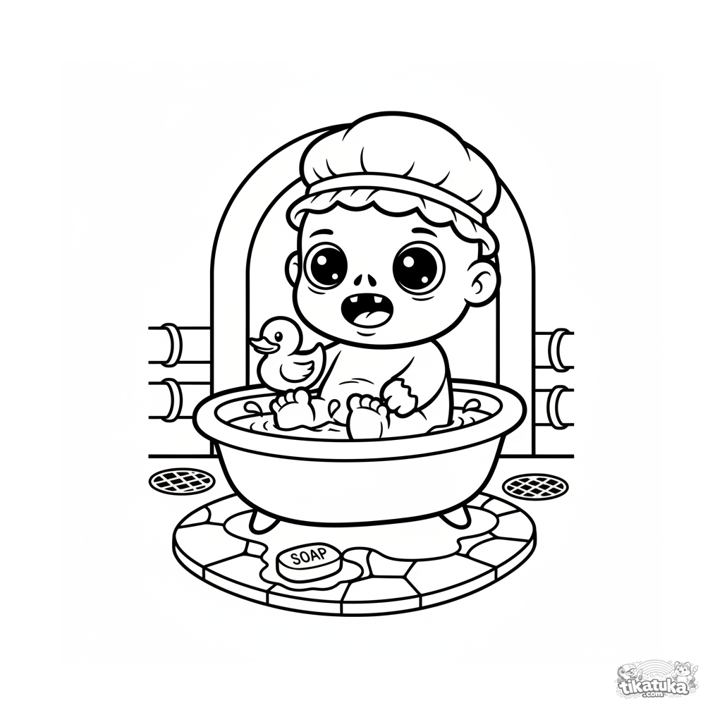 Página simple para colorear para niños pequeños: un lindo bebé zombi bañándose en una tina en la alcantarilla. Formas grandes, contornos gruesos, muy pocos detalles. Para niños de 2 a 3 años.
