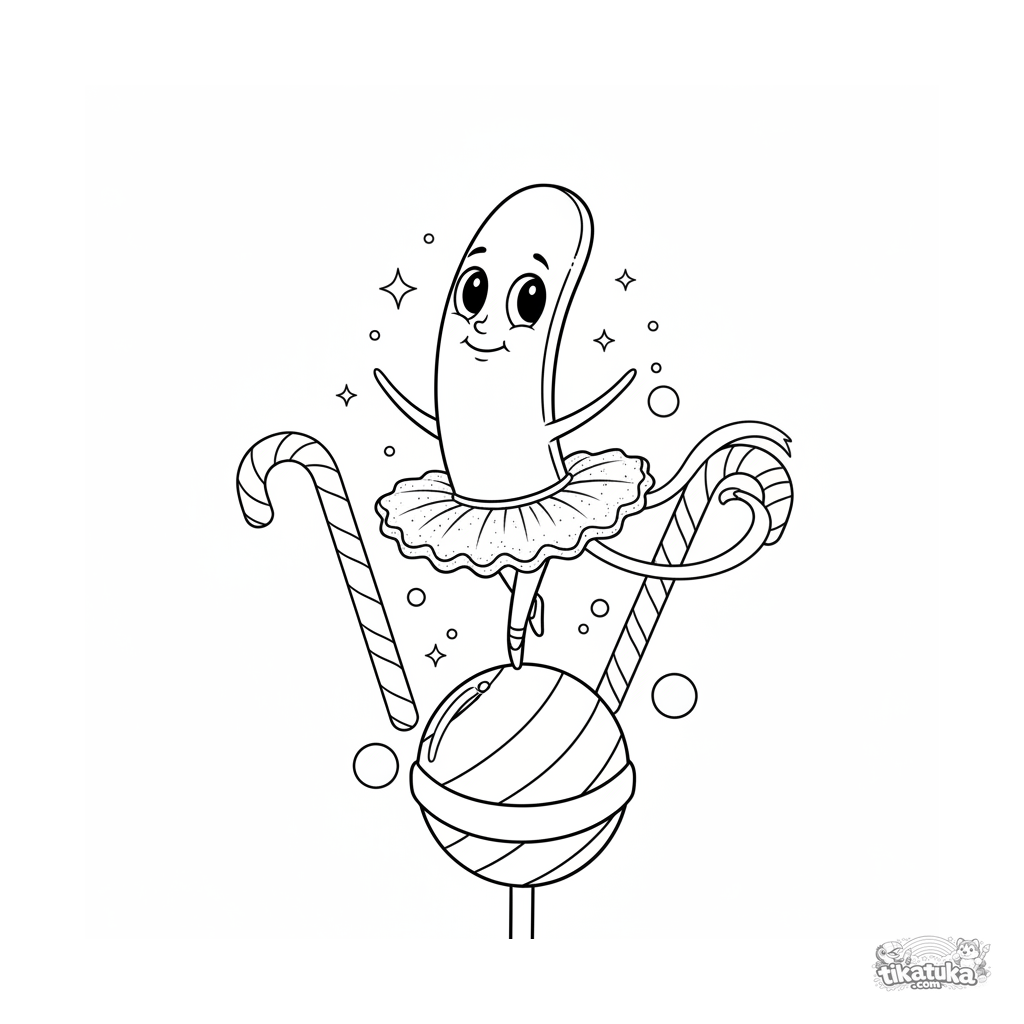 Página para colorear para 7-9 años estilo Disney: un bacilo bailarina grácil en tutú de azúcar baila en la punta de una piruleta. Líneas fluidas.