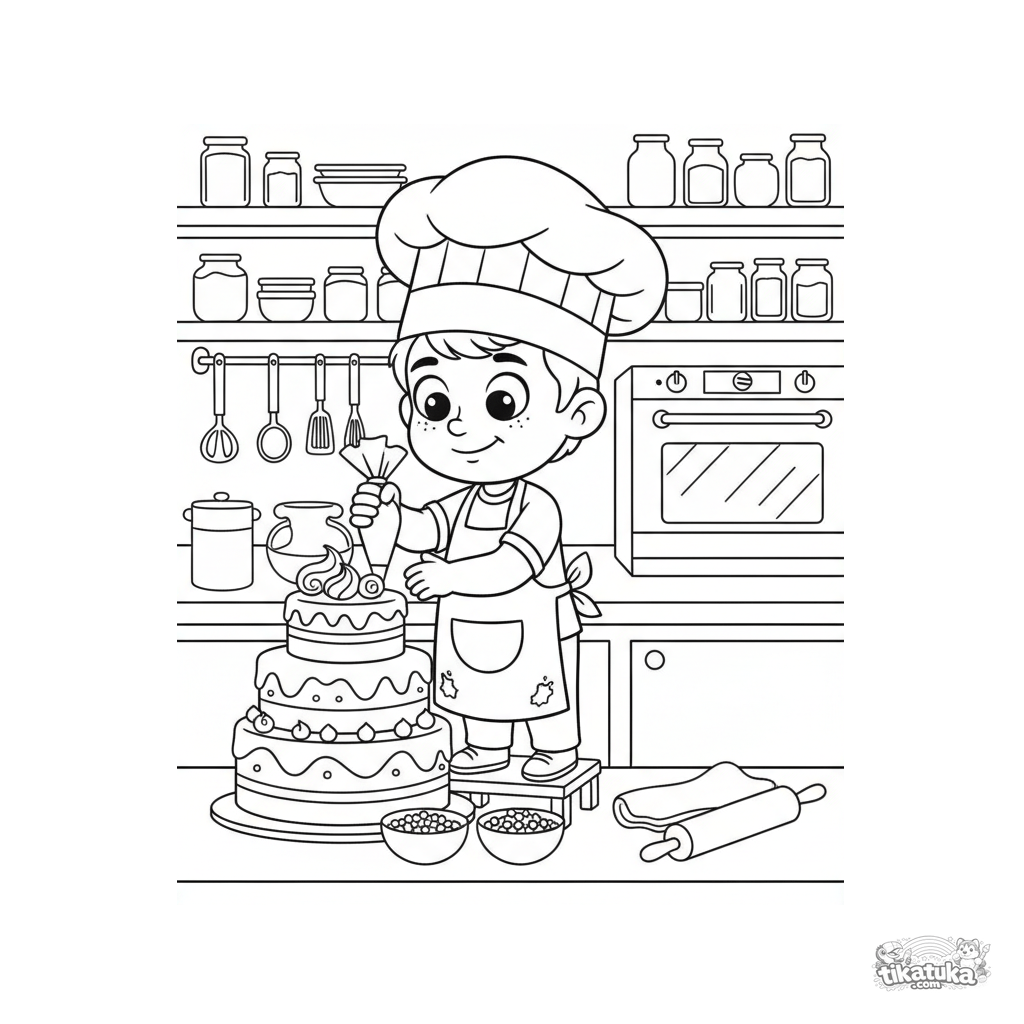 Página para colorear de un niño panadero decorando un pastel de pisos en una panadería. Para niños de 4 a 6 años.
