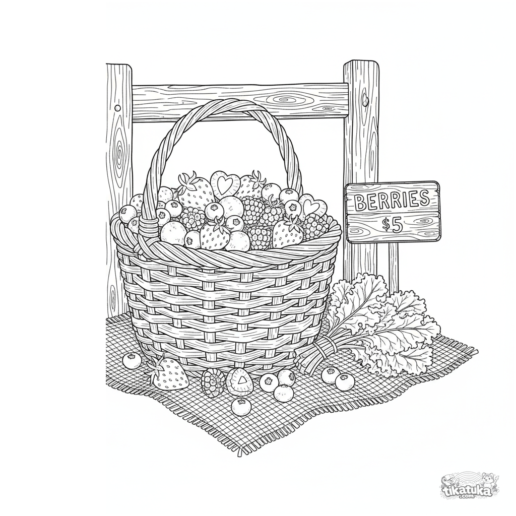 Página para colorear compleja para 10-12 años: una cesta de mimbre rebosante de bayas mixtas en un puesto de mercado. Estilo grabado en linóleo.