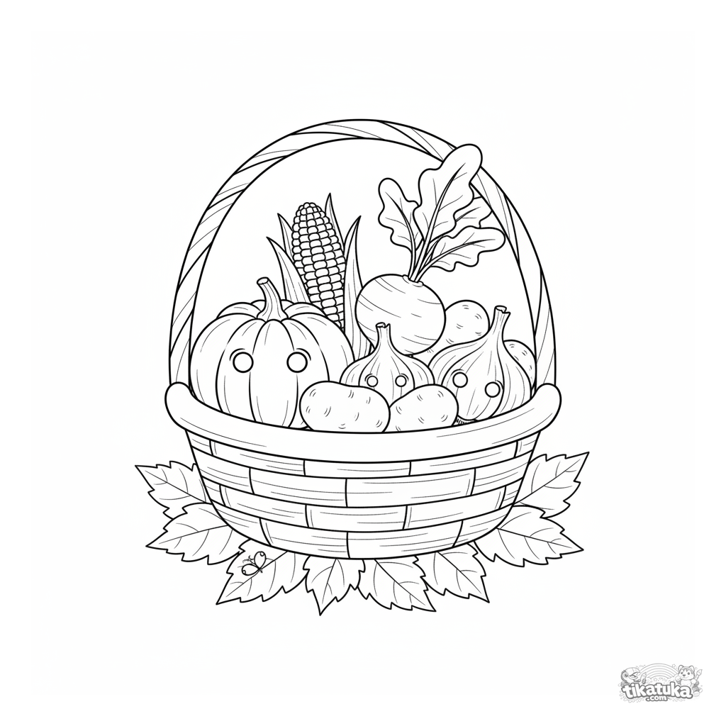 Página para colorear compleja para 10-12 años: una cesta rústica llena de verduras de otoño. Naturaleza muerta detallada en estilo acuarela y boceto.