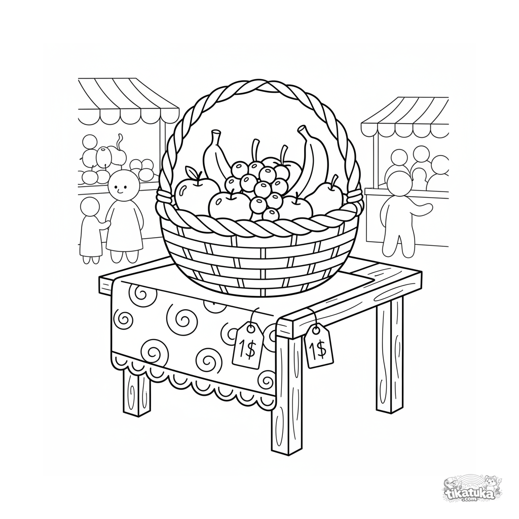 Página para colorear para niños 4-6: una cesta tejida llena de frutas variadas descansa en una mesa de puesto de mercado. Estilo folk-lubok con patrones simples y composición vibrante.