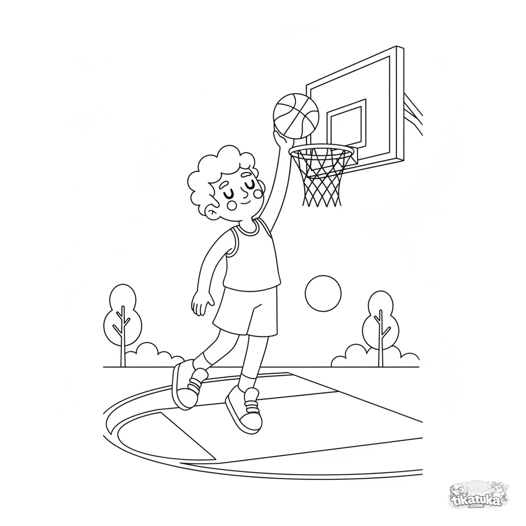 Página para colorear para niños: un jugador de baloncesto salta para hacer una bandeja en una cancha exterior. Para 4-6 años, escena simple y enérgica.
