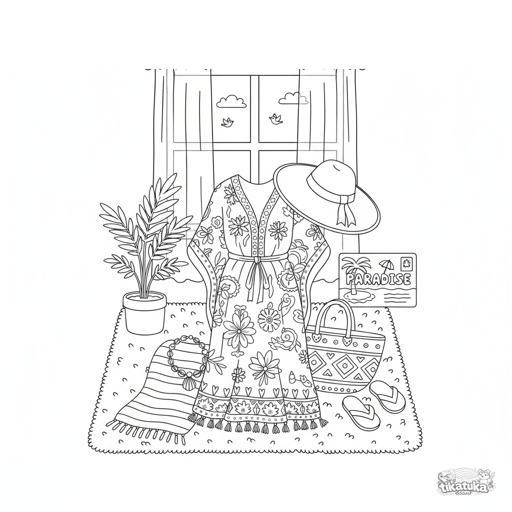 Página detallada para colorear para niñas 10-12: conjunto de playa de verano en vista plana con un cáftán, sombrero, toalla y accesorios en una escena de dormitorio.
