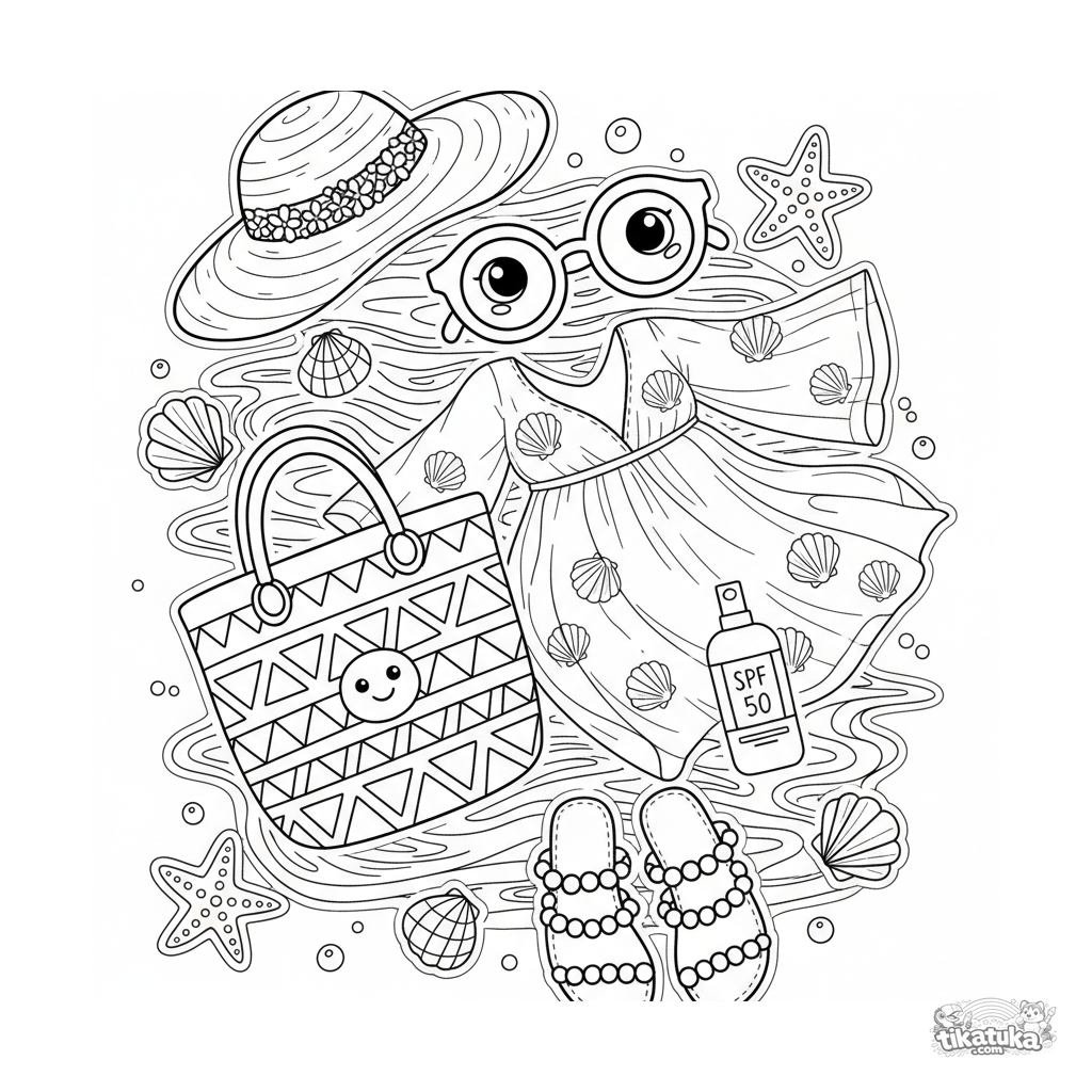 Página para colorear vibrante para niñas 10-12 años: disposición plana de un atuendo de playa sobre arena. Cubrepiel transparente, sombrero, sandalias, bolso, conchas marinas. Muchos elementos superpuestos y texturas.