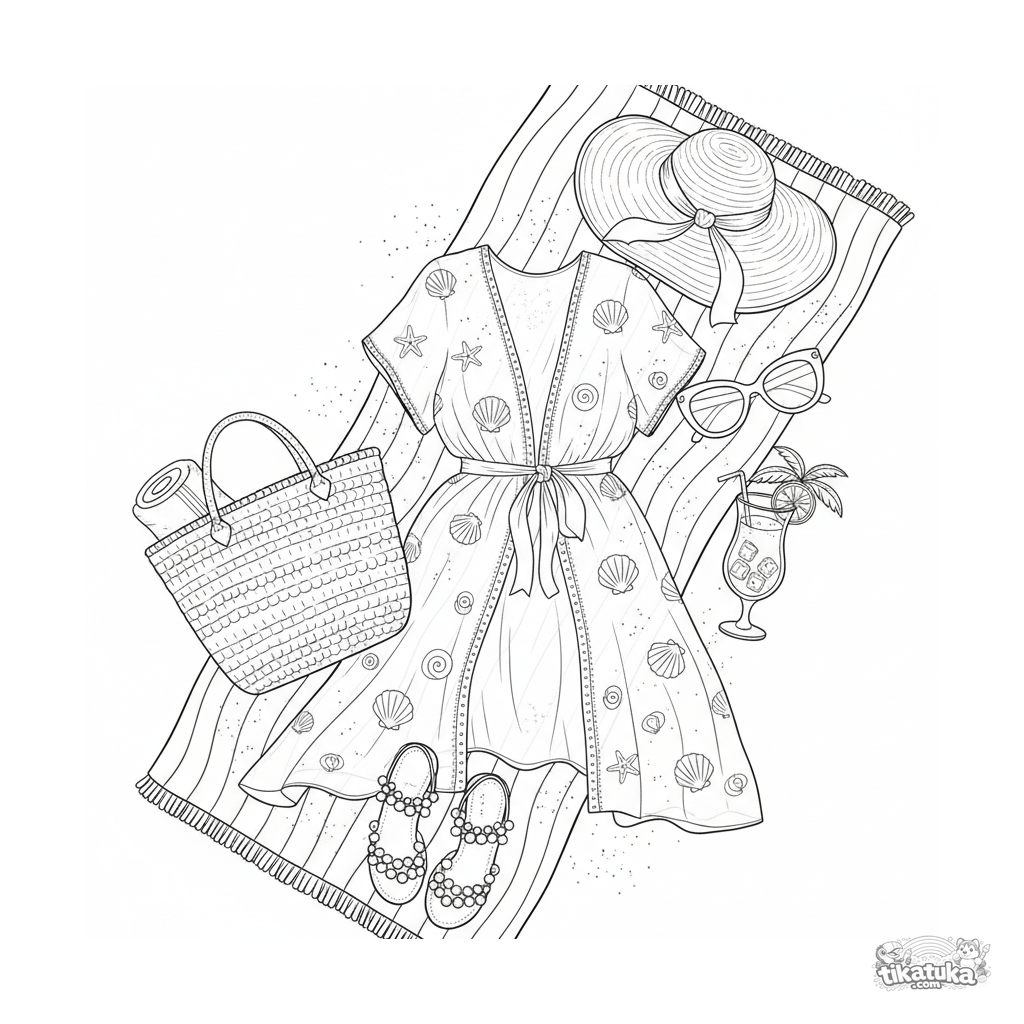 Página para colorear detallada para niñas: una disposición plana de un look de playa completo con una cubierta, sombrero, bolso y otros accesorios sobre una toalla con arena.