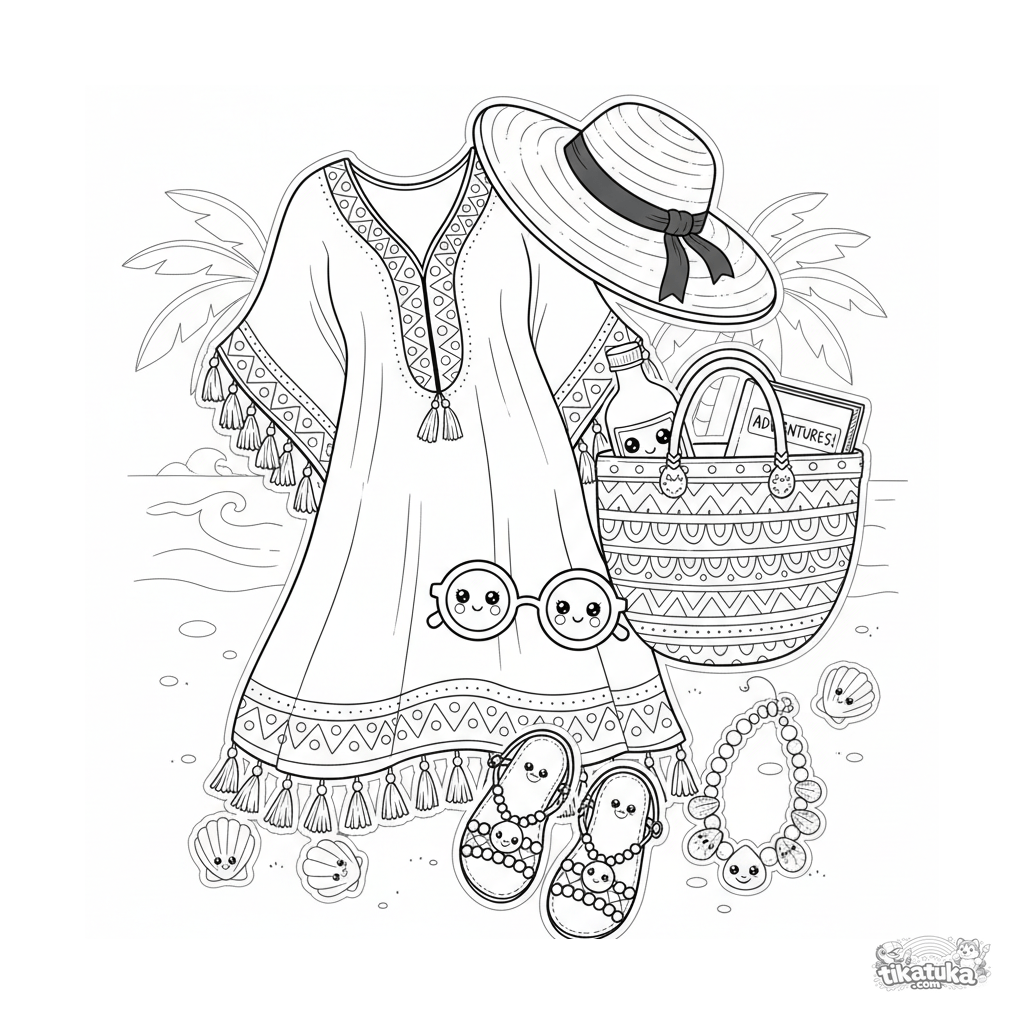 Página vibrante para colorear para niñas 10-12: atuendo de playa con caftán, sombrero y accesorios desplegados en arena. Texturas detalladas, fondo con palmeras y océano.