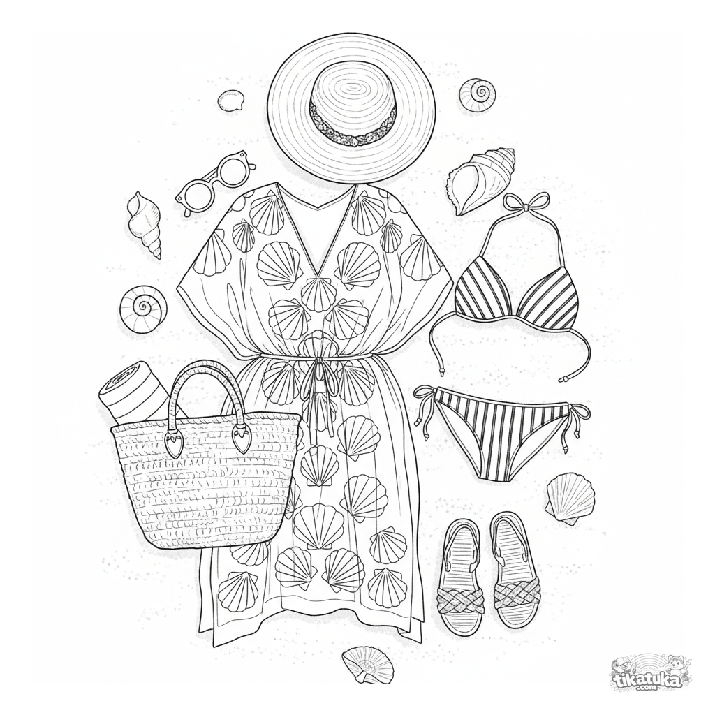 Página para colorear detallada para 10-12 años: conjunto de playa dispuesto en plano sobre arena con kaftán, bikini, sombrero y accesorios. Tema verano con muchas texturas.