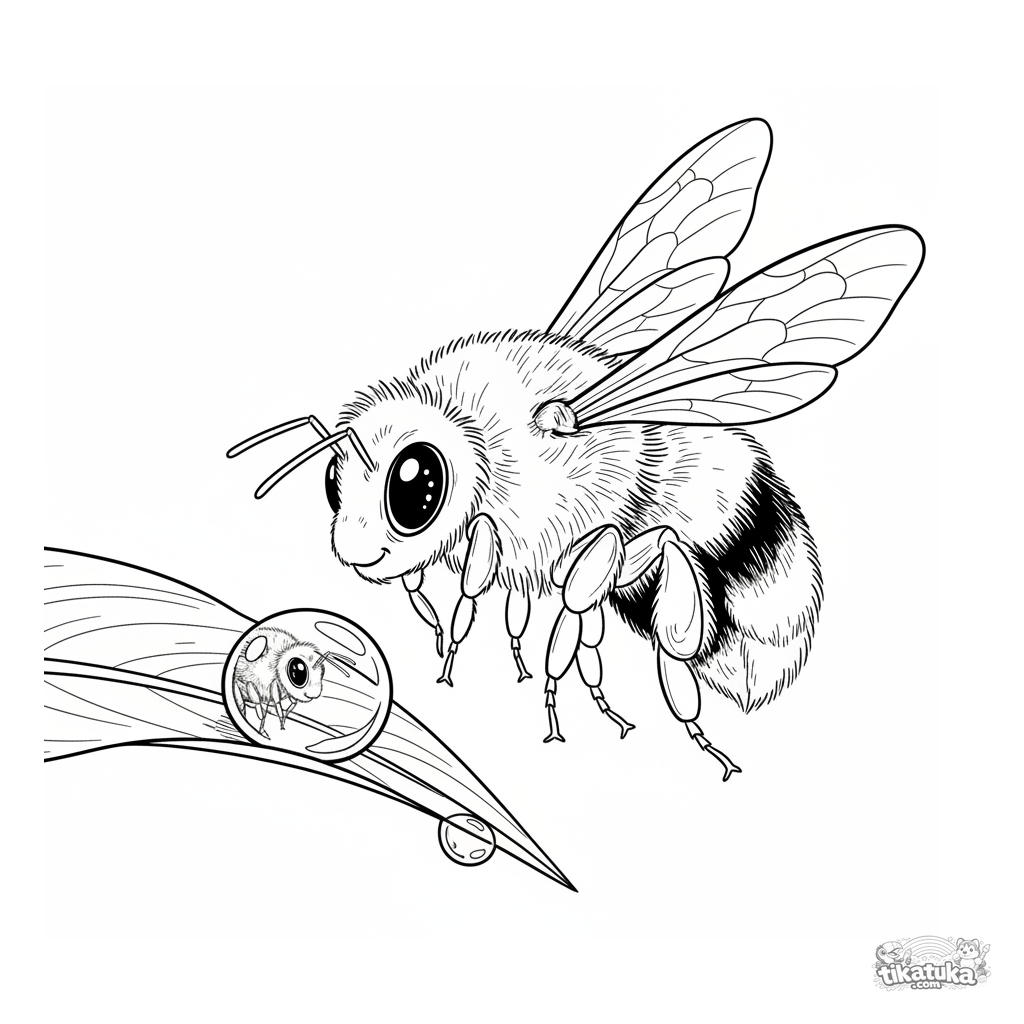 Página para colorear realista para niños 10-12: un abejorro peludo se cierne ante una gota de rocío perfecta como un espejo. Muchos detalles anatómicos.