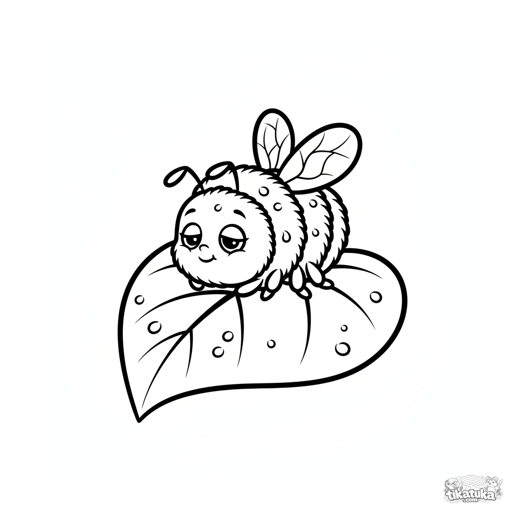 Página para colorear simple para niños pequeños 2-3: una abeja esponjosa descansa en una hoja grande con gotas de rocío. Formas grandes y claras.