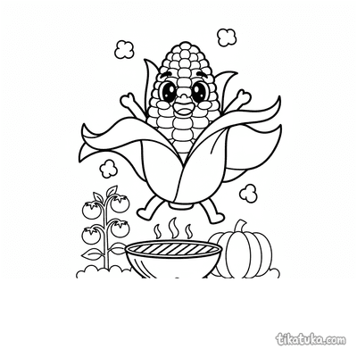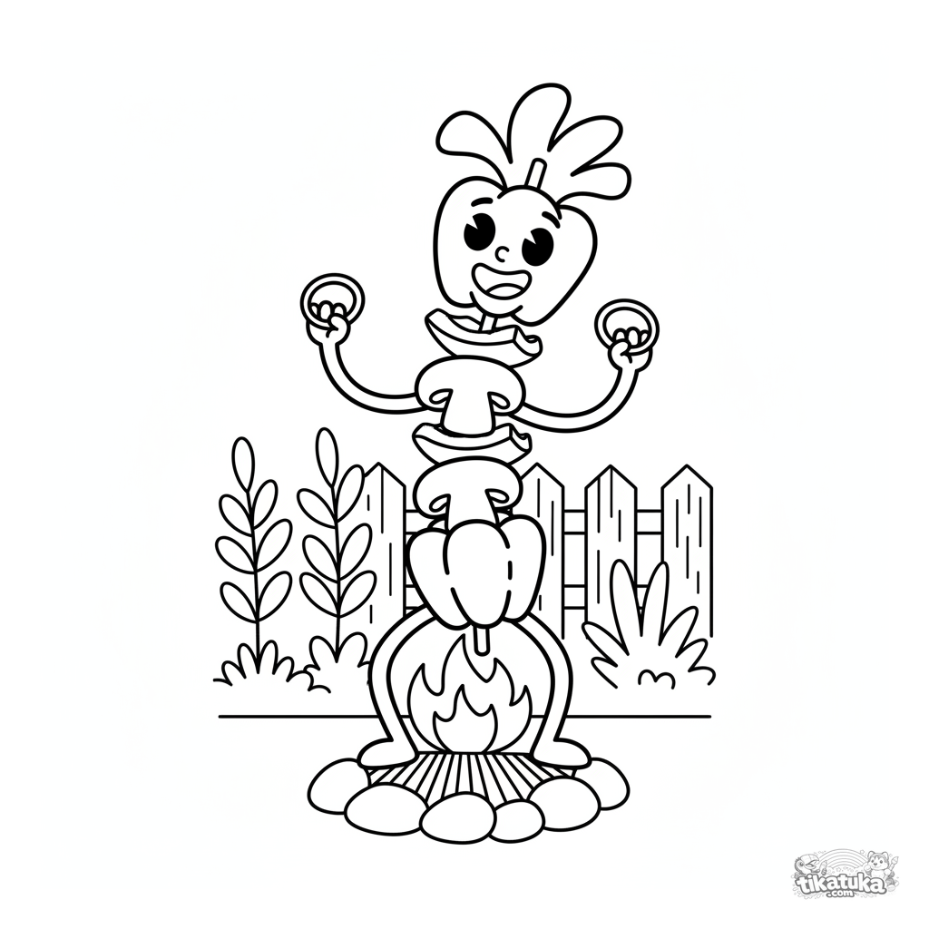 Página para colorear para preadolescentes 7-9 años: una brocheta de pimiento feliz con extremidades bailando sobre brasas de parrilla.