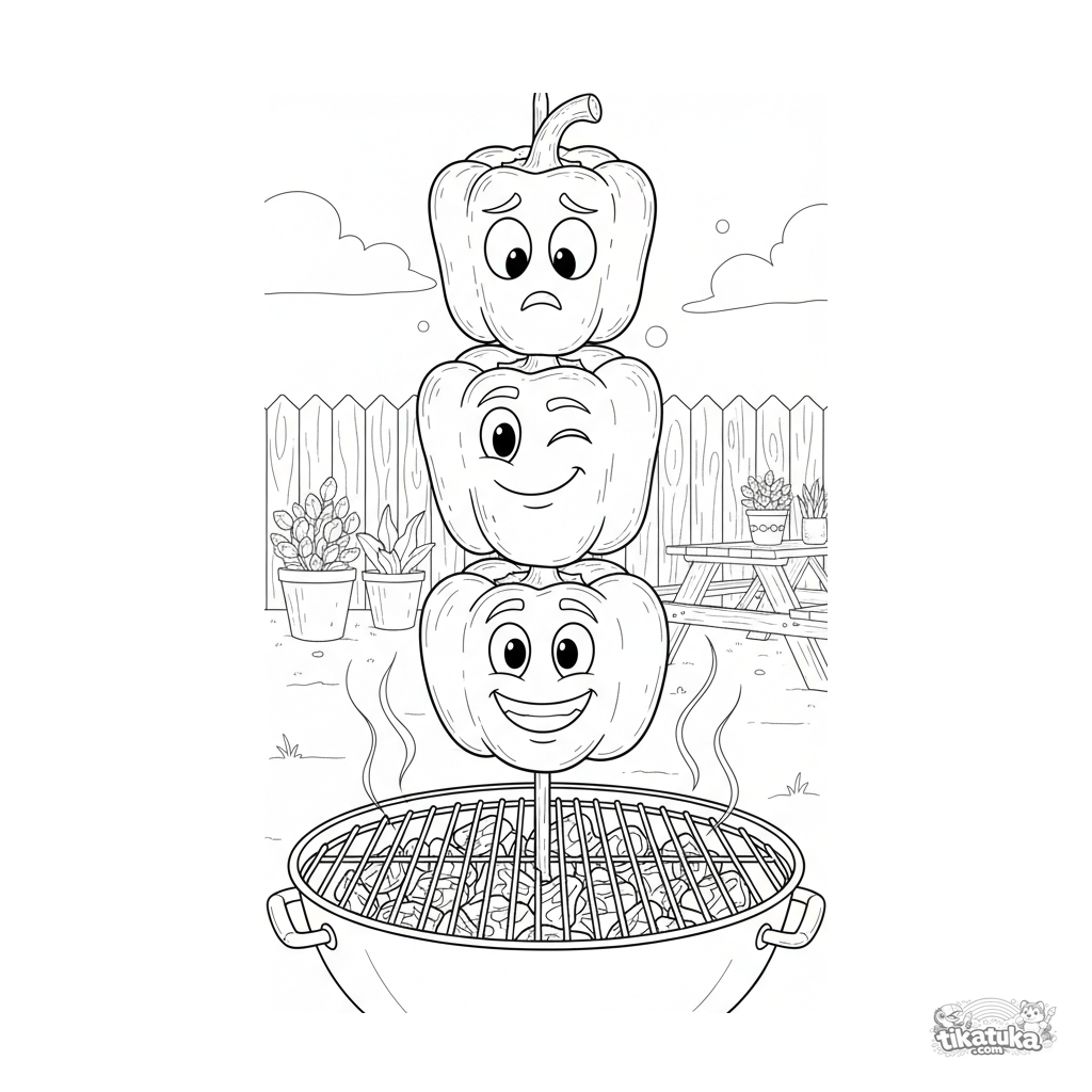 Página para colorear detallada para 10-12 años: tres pimientos en brocheta sobre carbón en jardín. Líneas realistas, emociones distintas, márgenes blancos.