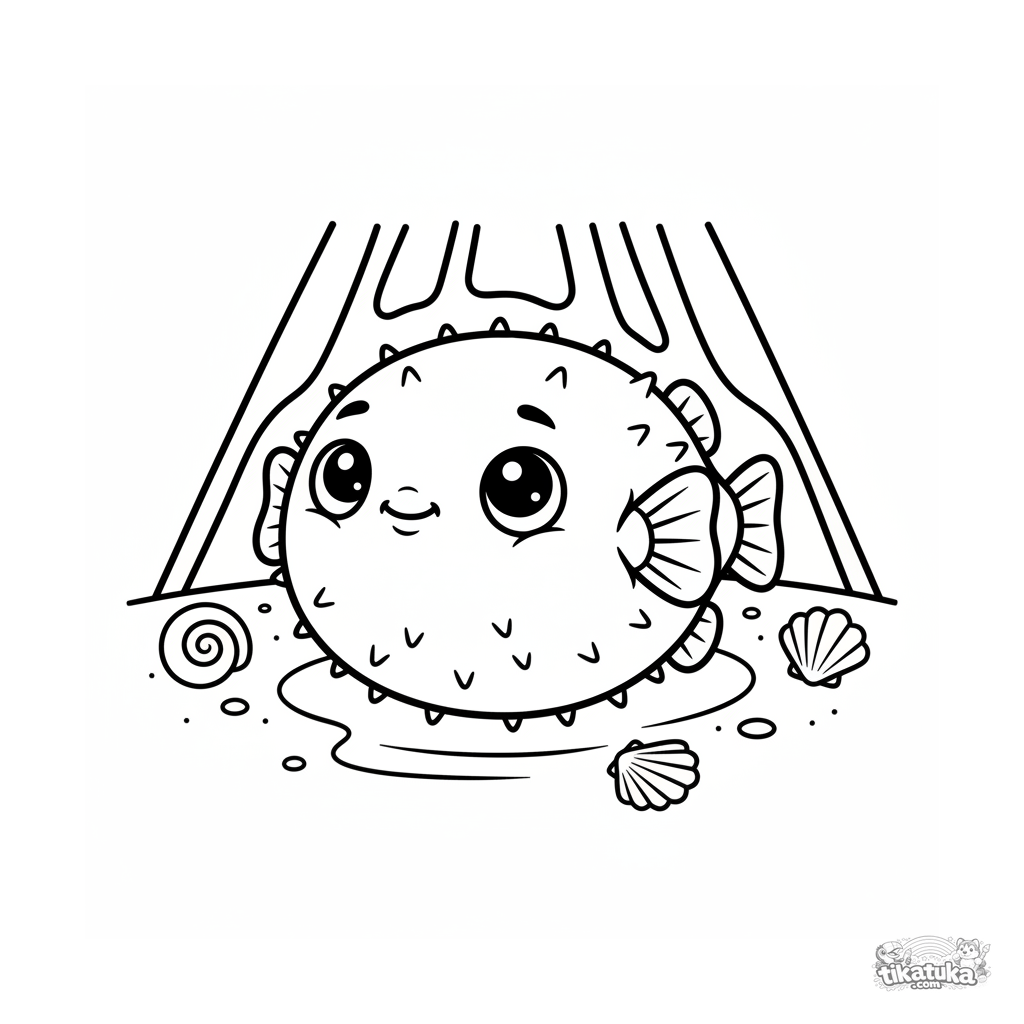 Página simple para colorear para niños pequeños: un pez globo redondo descansa en el fondo arenoso bajo rayos de sol. Para 2-3 años. Formas grandes, márgenes amplios.