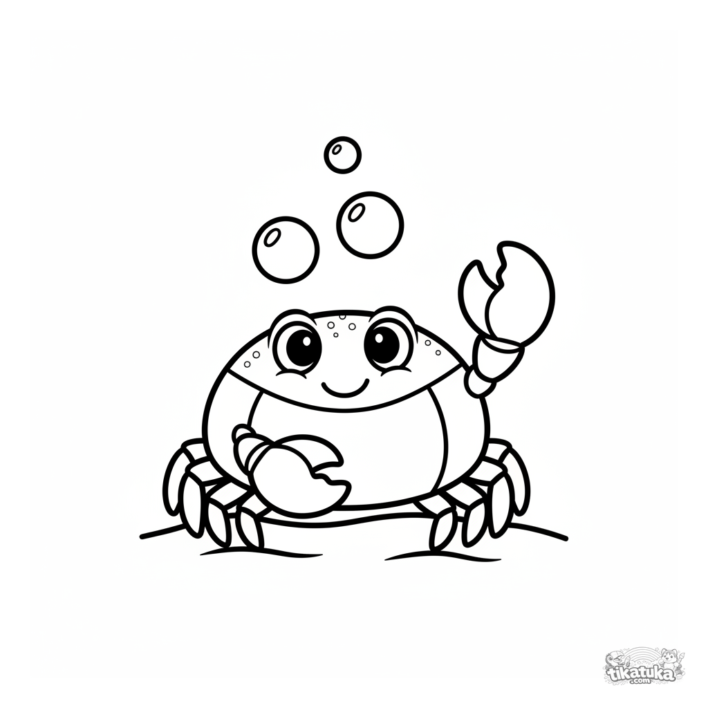 Página para colorear para niños pequeños 2-3: un cangrejo grande y amigable se sienta en la arena en aguas poco profundas. Formas muy simples.