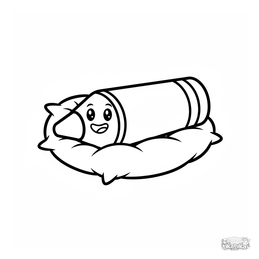 Página para colorear para niños pequeños: un crayón grande y amigable con cara sonriente acostado en un cojín suave. Forma cilíndrica simple, ojos de botón, perfecto para 2-3 años.