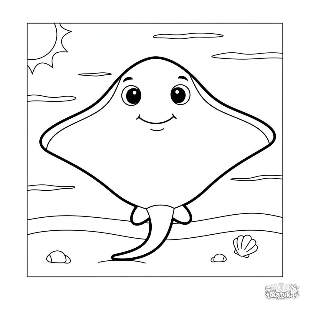 Página para colorear simple de una mantarraya grande y amigable descansando en arena soleada. Para niños pequeños 2-3 años, formas simples y grandes.