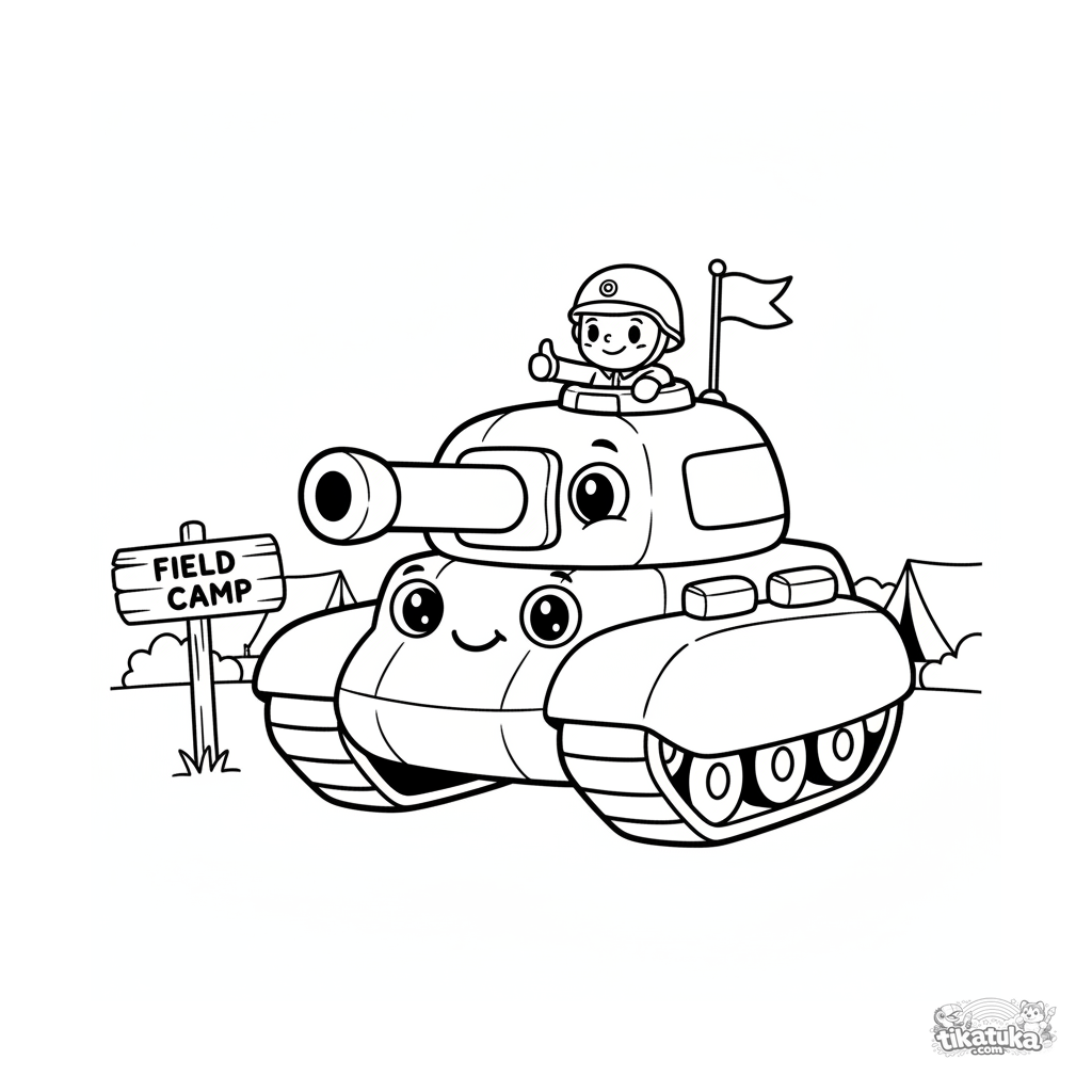Página para colorear muy sencilla para toddlers 2-3: un tanque grande y amigable custodia la entrada a un campamento. Formas grandes y claras.