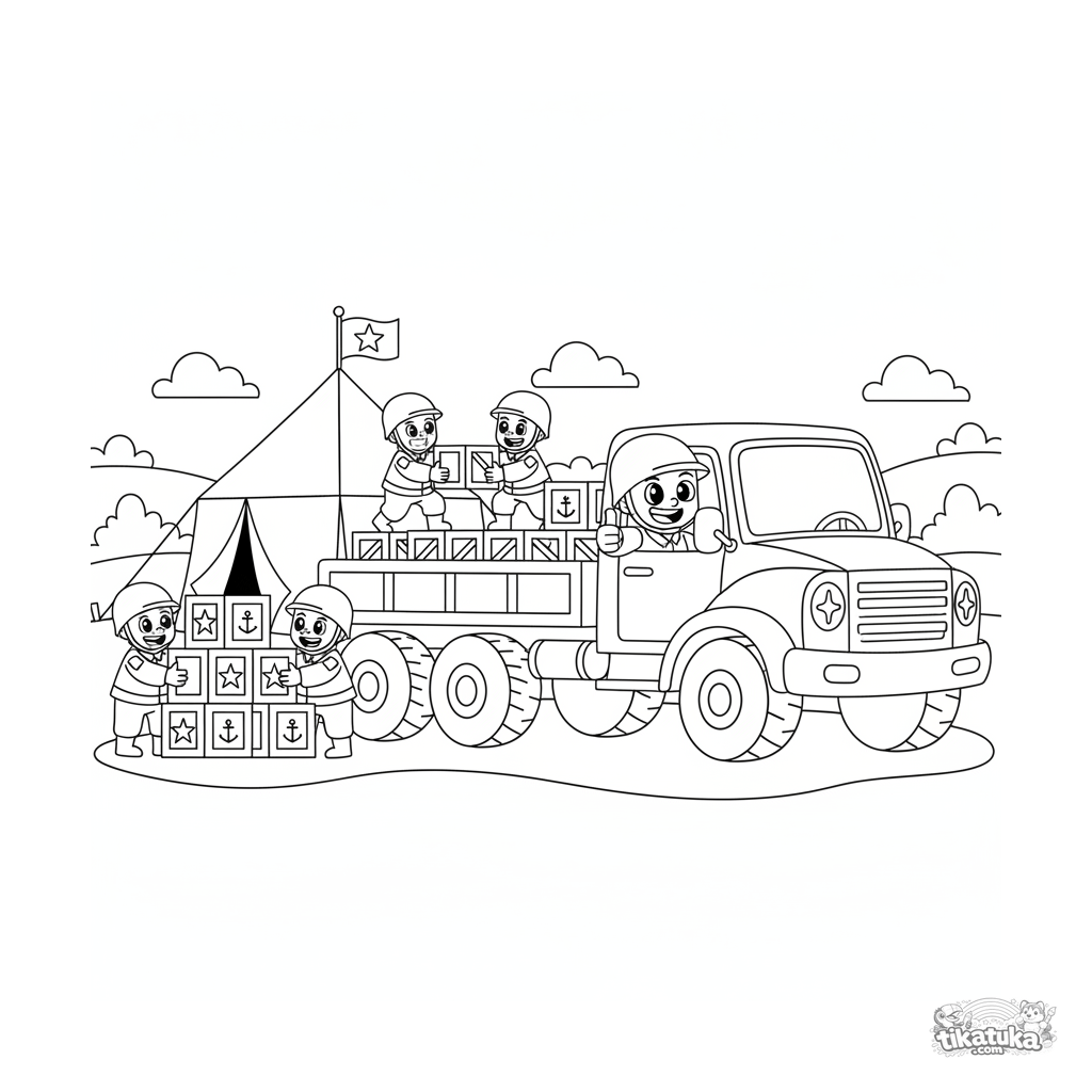 Página para colorear para 7-9 años: un gran camión militar descarga cajas de suministros junto a una carpa de cuartel general. Soldados trabajan, conductor da un pulgar arriba.