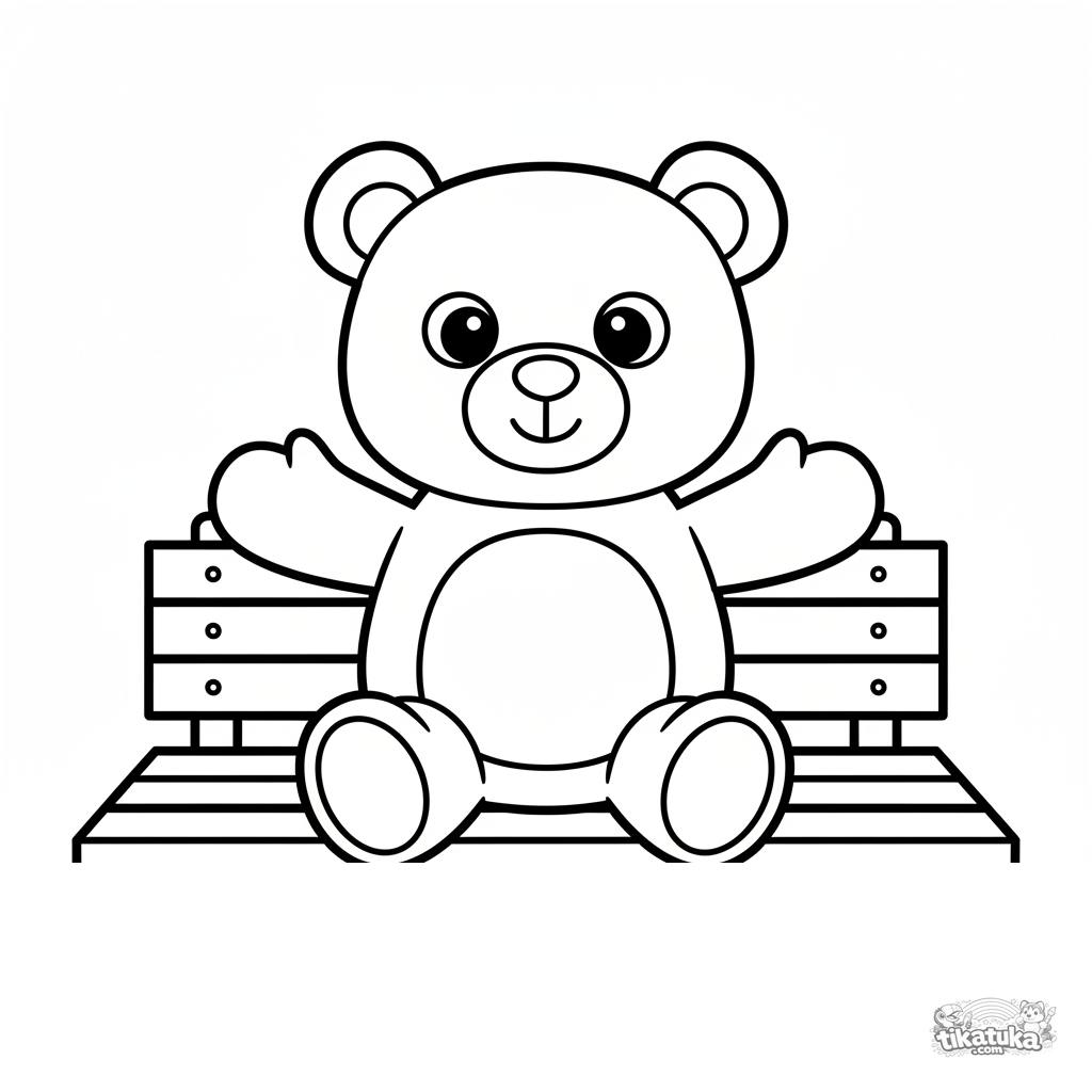 Página para colorear muy simple para niños pequeños 2-3: un gran oso de peluche sentado en un banco del parque. Formas grandes, mucho espacio libre.