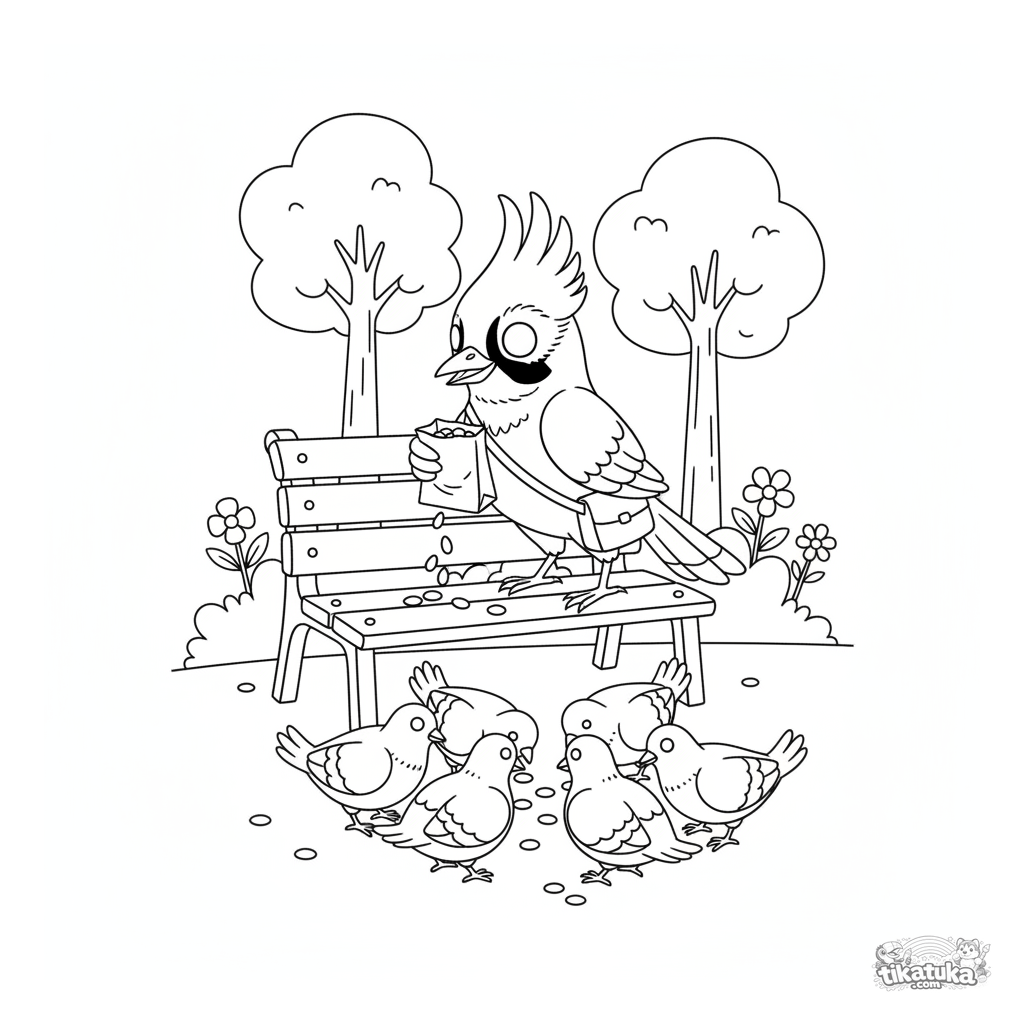Página para colorear para niños de 4-6 años en estilo Disney: un arrendajo con bolsita alimenta a un grupo de palomas desde un banco del parque.