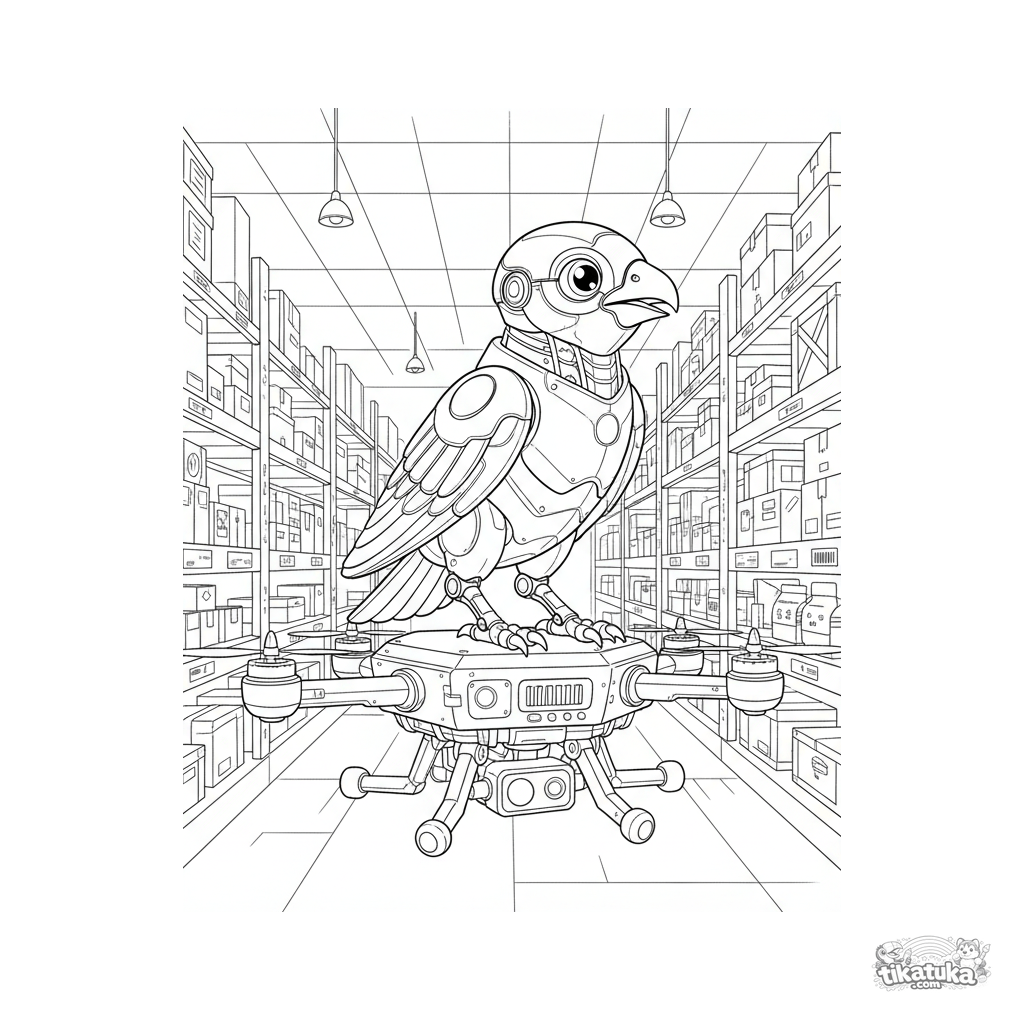 Página para colorear para niños mayores 10-12: un robot realista con forma de pájaro posado en un dron escáner volador, observando un almacén. Formas mecánicas detalladas.