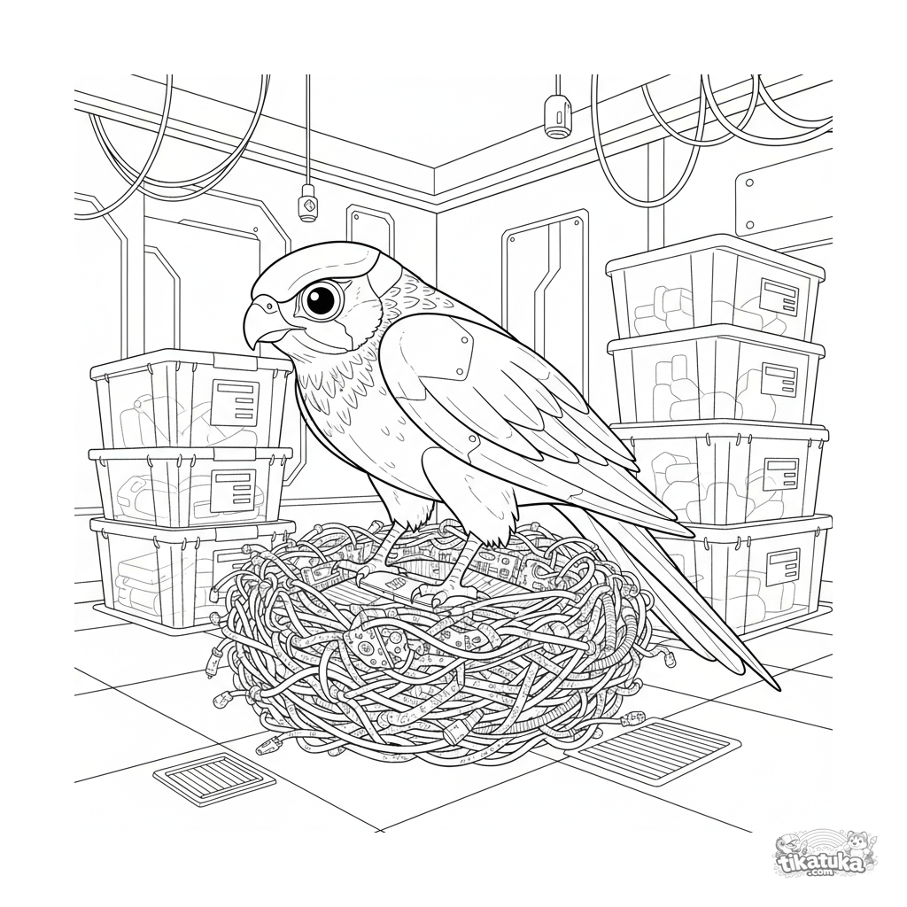 Página para colorear compleja para niños mayores 10-12: un drón con forma de pájaro descansa en una estación de carga tipo nido entre cajas en un almacén de alta tecnología. Muchos detalles y texturas.