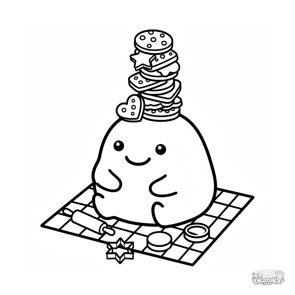 Página muy simple para bebés 2-3 años: un monstruo burbuja equilibra una torre de galletas en un picnic. Contornos grandes y claros.
